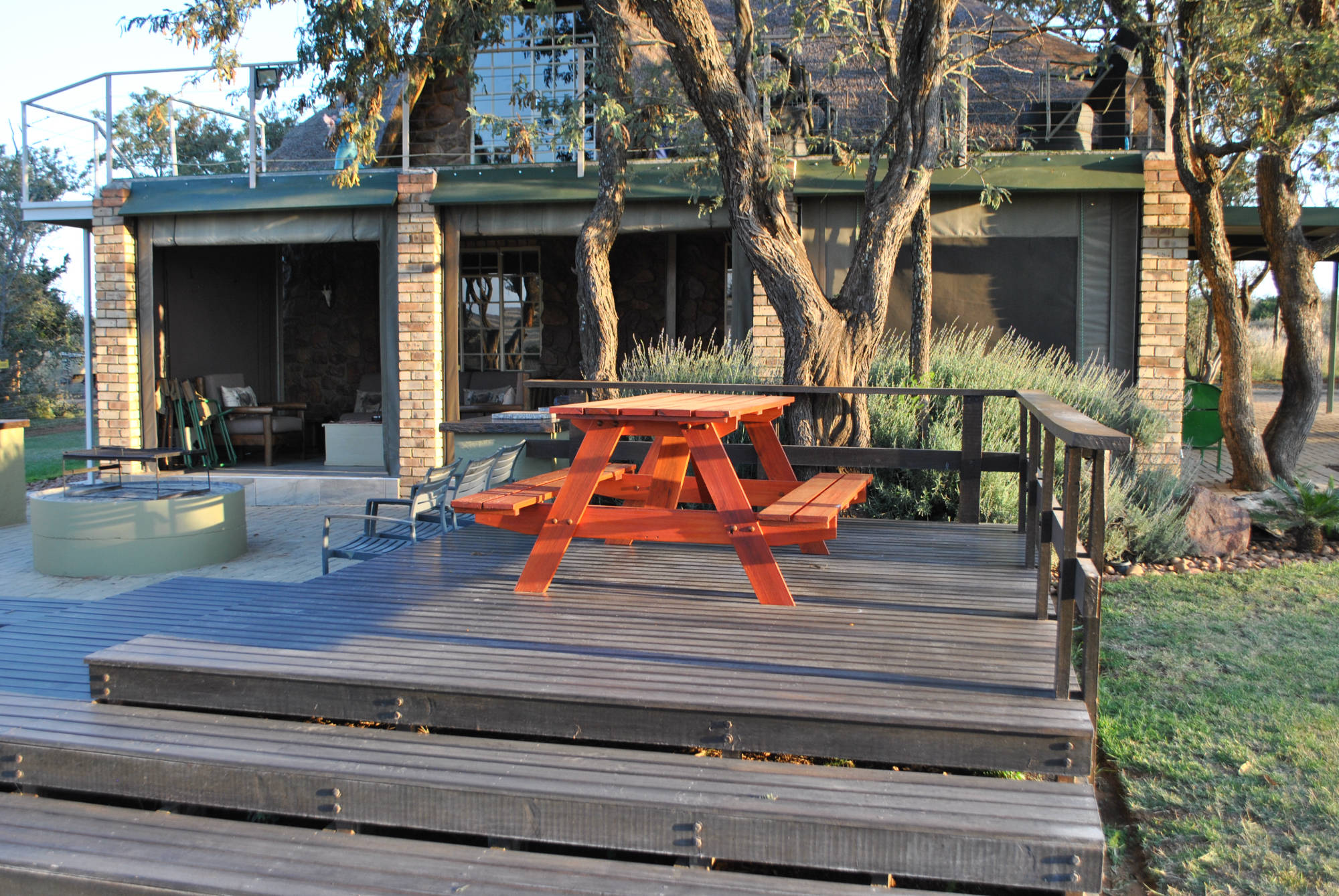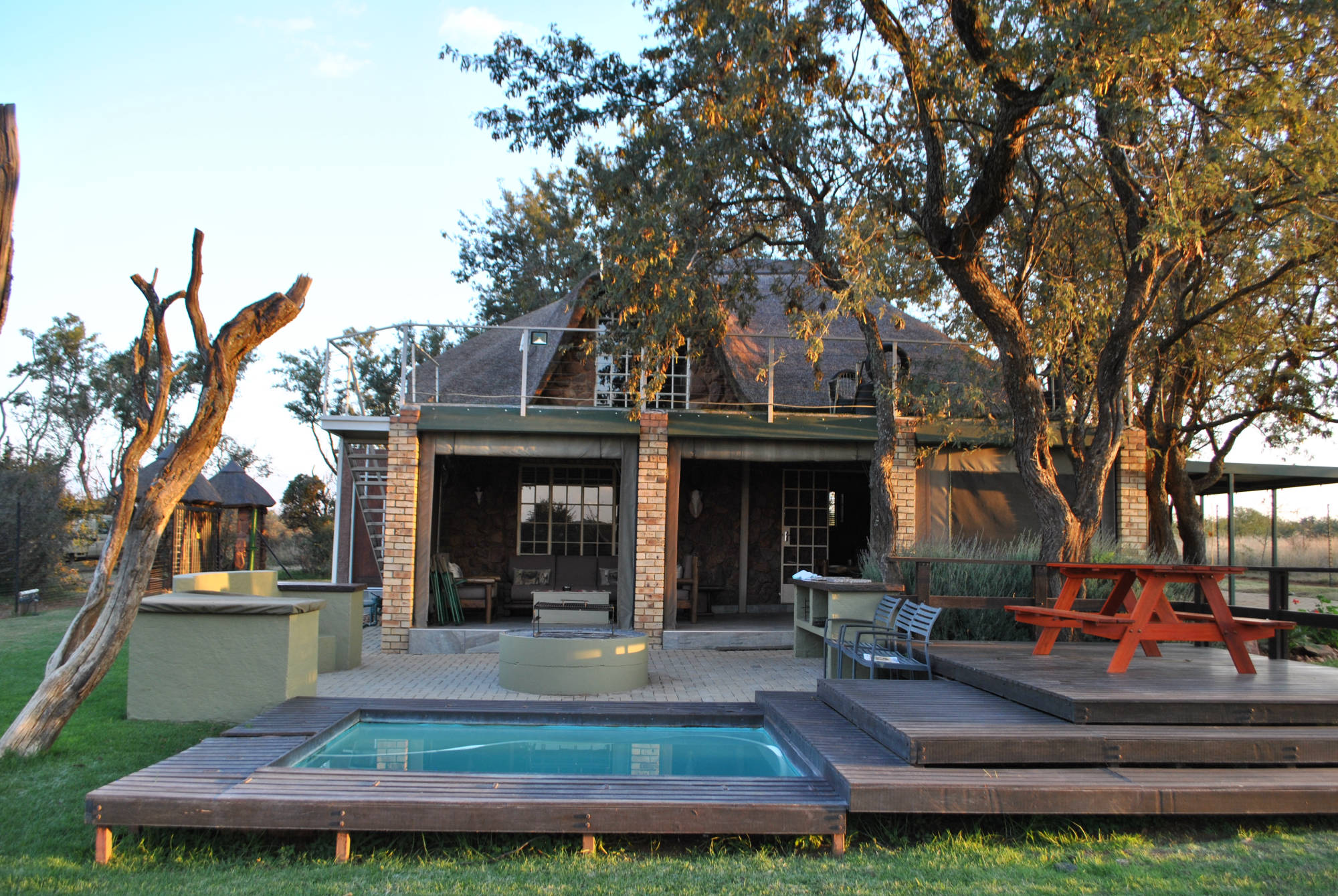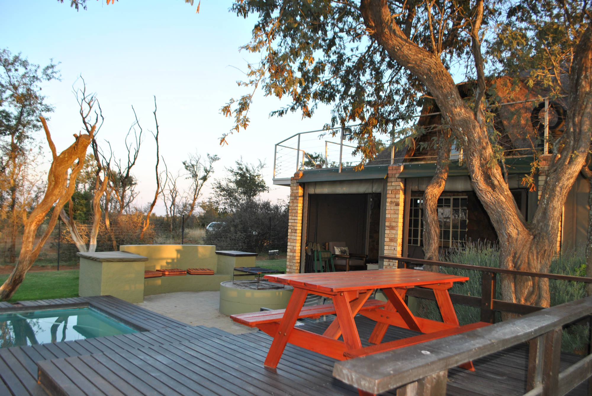 The unit consist of 2 bedrooms and can accommodate 7 guests comfortably. The main bedroom has a double bed with an en-suite bathroom with shower and the second bedroom upstairs has 3 single beds, leading out to an outdoor deck overlooking the farm. The second bathroom is a separate private bathroom with bath and shower. Downstairs there is a spacious open-plan lounge with a double sleeper couch and a fully equipped kitchen. Leading out from the open plan lounge area there is a sheltered patio area with comfortable couches, 6 seater table and gas braai facilities. The outside area has a beautiful wooden deck swimming pool area, where guest can enjoy the spectacular bushveld surroundings and a open fire boma.